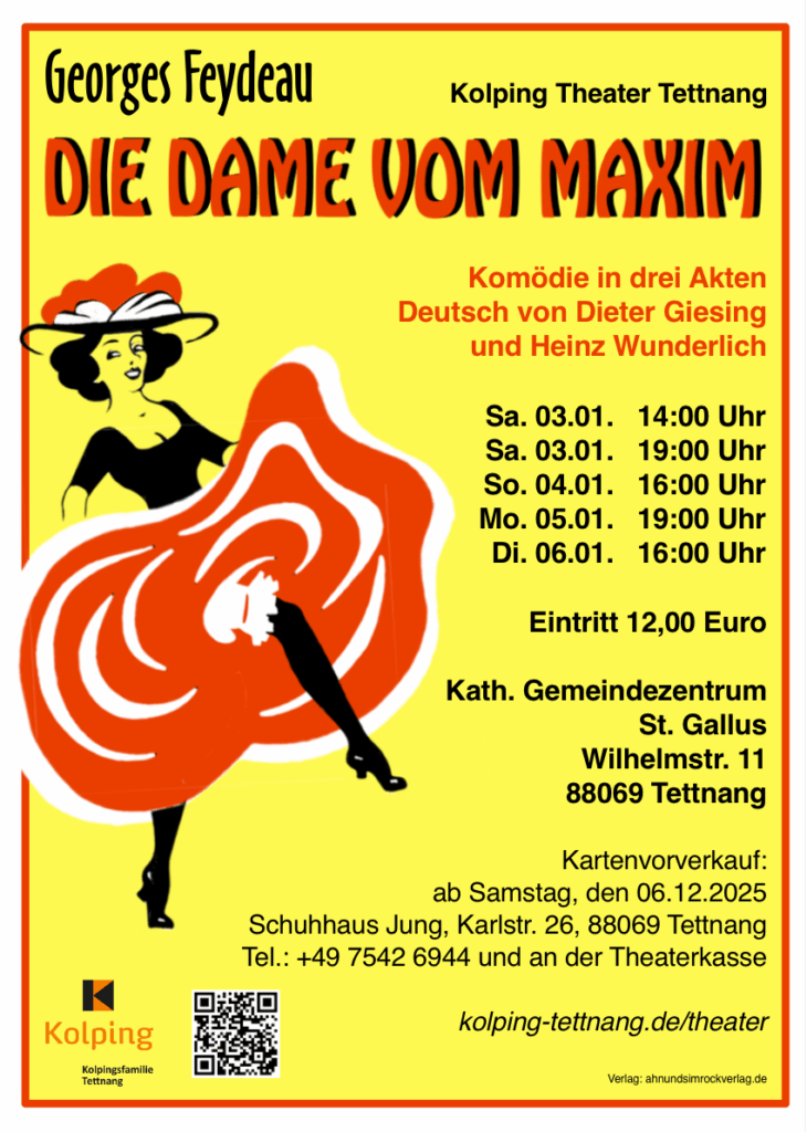 Mit dem Klassiker „Die Dame vom Maxim“ von Georges Feydeau, einer Komödie in drei Akten (Deutsch von Dieter Giesing und Heinz Wunderlich), startet die Kolpingsfamilie ins neue Jahr.